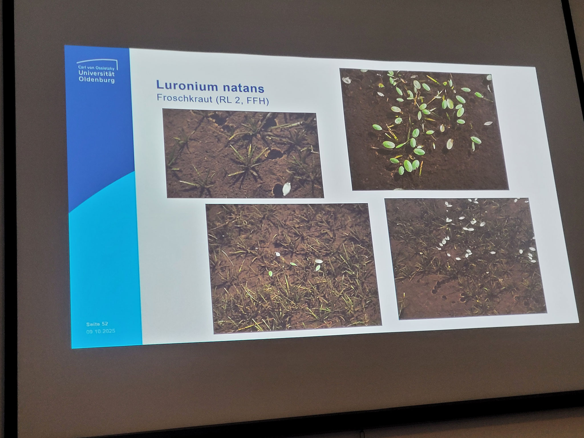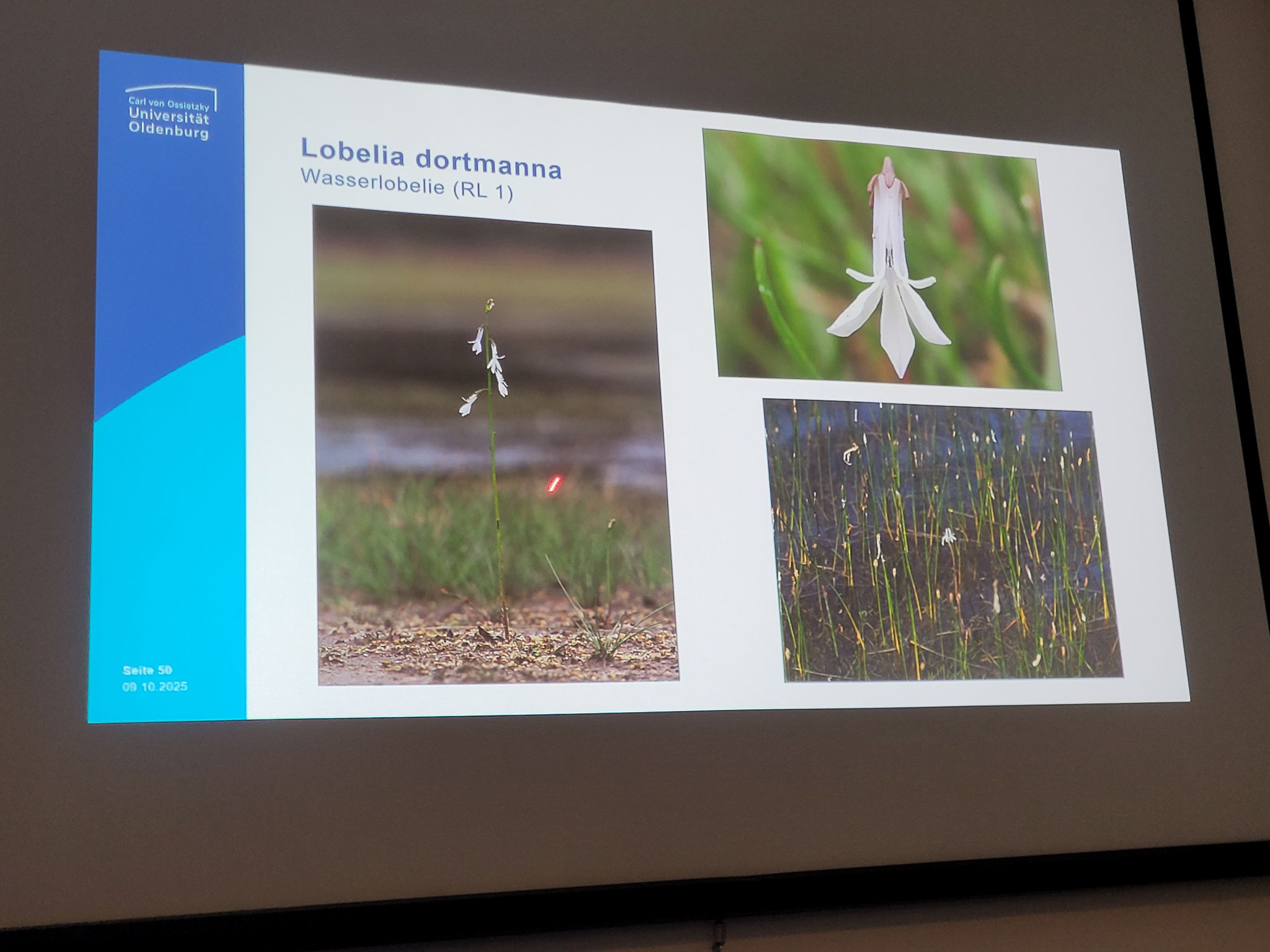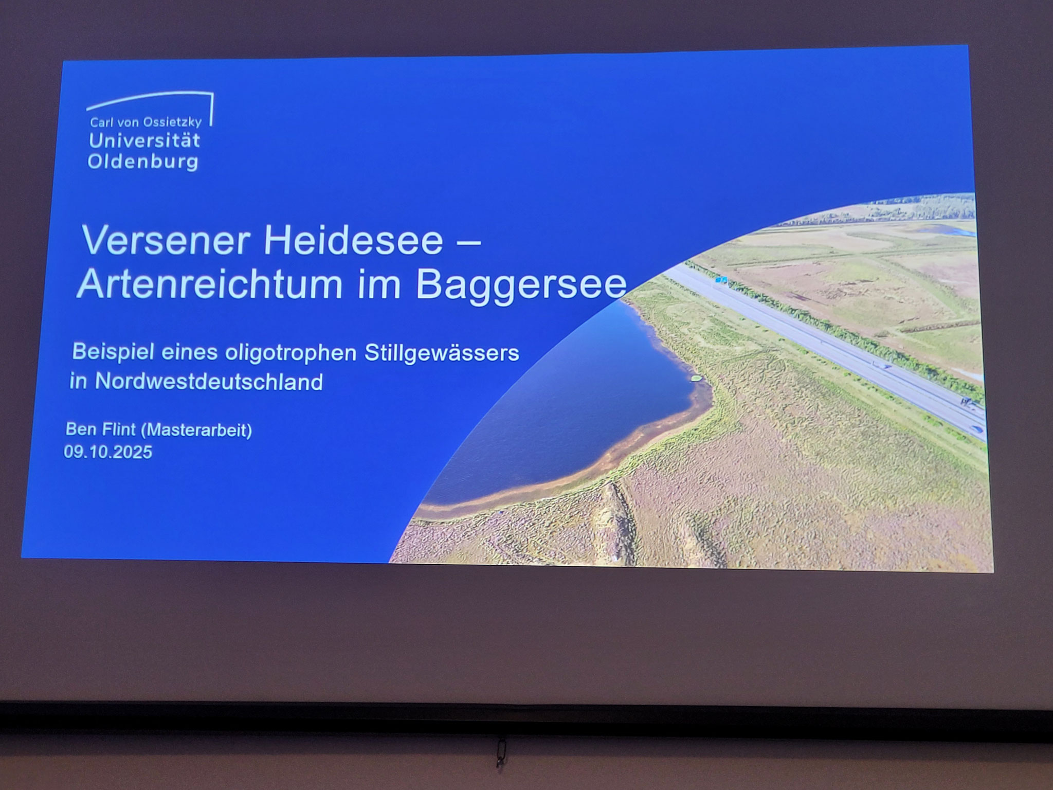In der Vortragsreihe "Natur am Donnerstag" berichtete Ben Flint am 09.10.2025 über seine Untersuchungen im NSG Versener Heidesee im Rahmen seiner Masterarbeit. Der Vortragsraum in der NABU-Geschäftsstelle war bis auf den letzten Platz besetzt. Ben Flint trug sehr interessante Beobachtungen zur Flora des Naturschutzgebietes vor. Dabei wurde klar, dass es sich hier um eines der wertvollsten Schutzgebiete des Landes handelt. Eine beeindruckende Anzahl gefährdeter und zum Teil vom Aussterben bedrohter Arten findet sich in großer Individuendichte im und am Versener Heidesee. Ben Flint beeindruckte mit seiner Fachkompetenz und seinem Fleiß. Es gelang ihm die Zuhörer/innen in die Zusammenhänge der Flora im Zusammenspiel mit verschiedenen Einflüssen, wie z.B. Stickstoffeintrag, Biotoppflege oder schwankenden Wasserständen einzuführen.