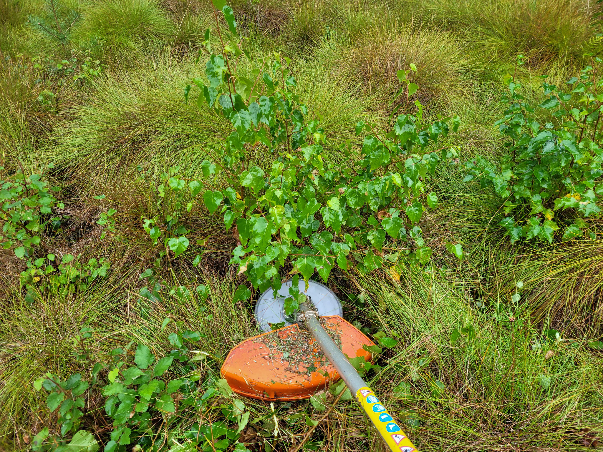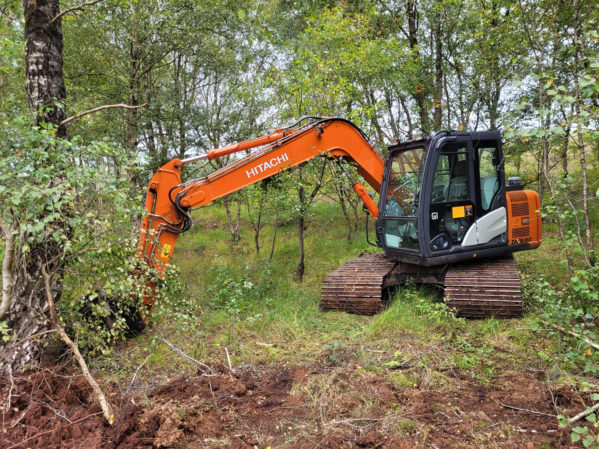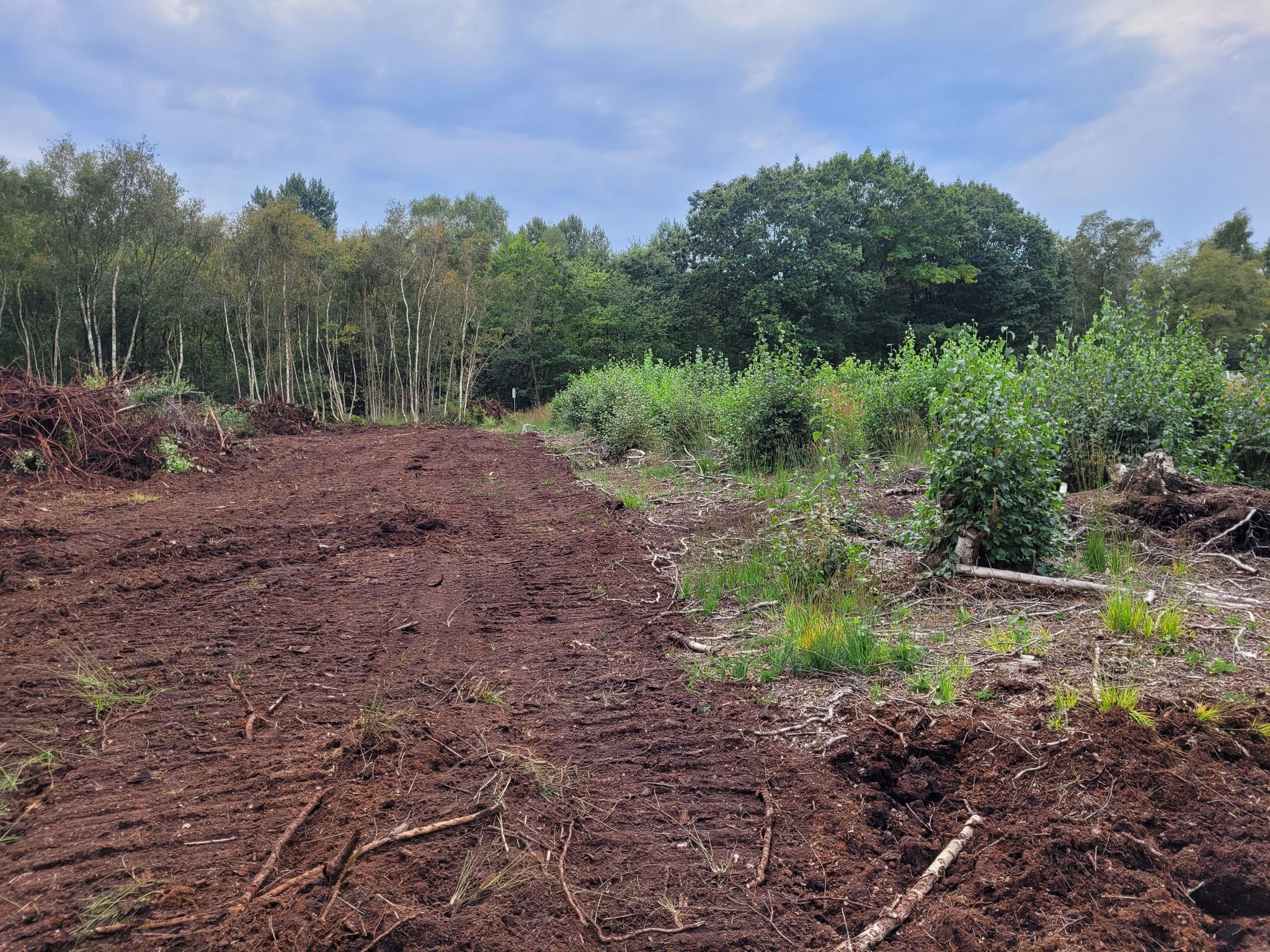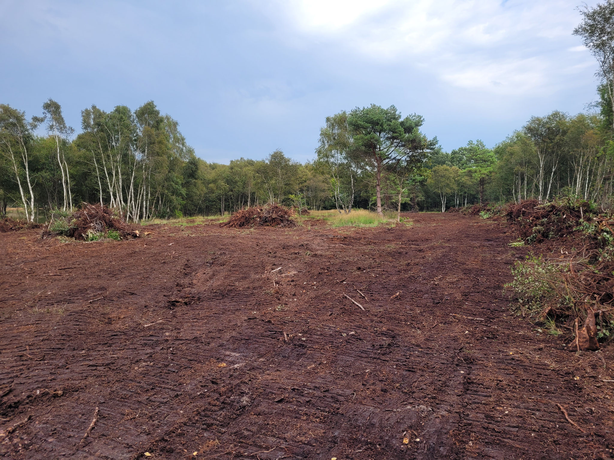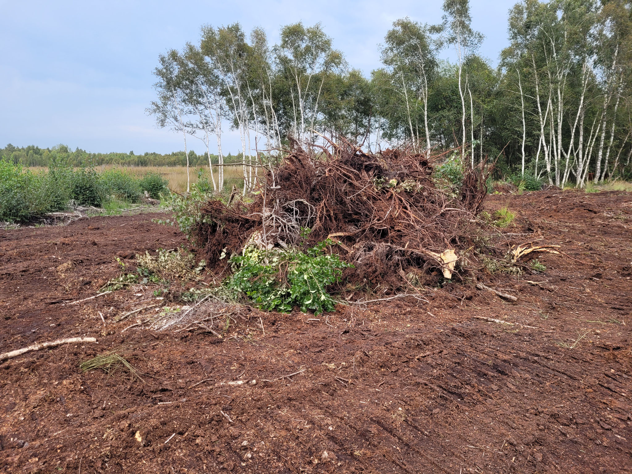 Nach dem Absägen der Birken blieben Baumstümpfe übrig, aus denen nun die Birken massiv wieder ausschlugen. Derzeit entfernt ein Bagger die Baumstümpfe, der offene Torfboden wird wieder freigelegt. Im Anschluss an diese Maßnahme soll Besenheide auf der Fläche ausgesät werden. Wir hoffen, dass sich in den nächsten Jahren wieder eine Heidelandschaft entwickelt.